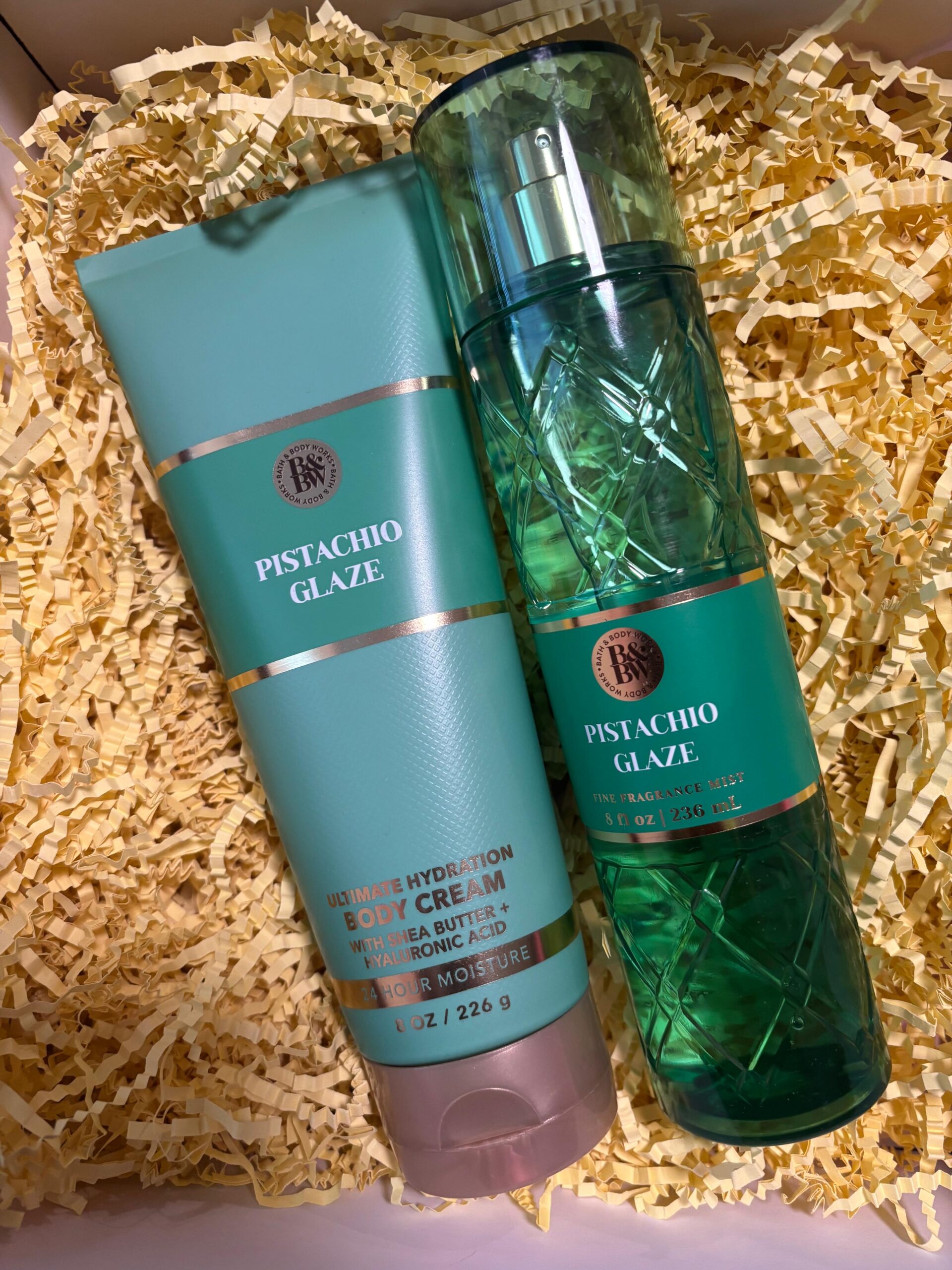A women’s 2pc set with mist and lotion featuring the sweet, nutty aroma of Pistachio Glaze for daily freshness and skin hydration.