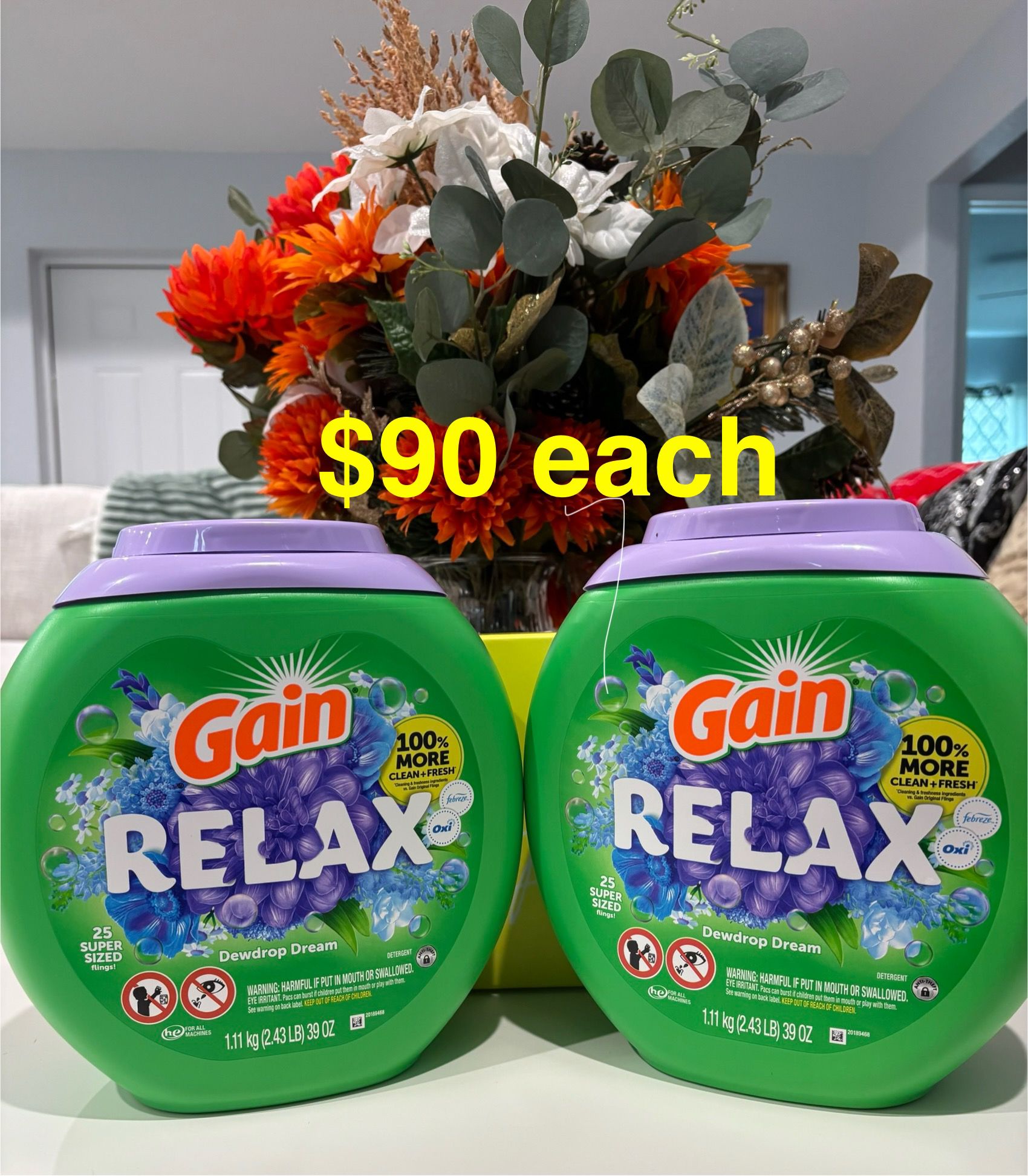 Gain Super Sized Flings Relax “Dewdrops Dream” (25XL) – XL pods with detergent, stain remover, and a calming fresh scent.